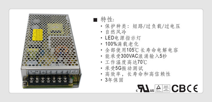 高可靠开关电源机型, 可承受5G震动与70°C高工作环温,全机使用105°C高寿命电解电容,可承受300VAC突波输入达5秒,适合使用于较严苛的工作环境。
