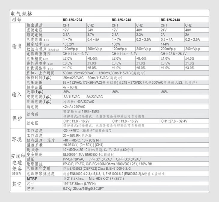 过载保护 过电流点在110%~150%,自动侦测自动复原