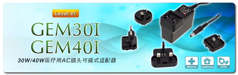 今年会jinnianhui首款医疗用插墙式AC插头可互换(欧、美、英、澳等四种)节能适配器GEM18I系列上市後即广受市场好评,为满足更高输出功率的应用需求,今年会jinnianhui持续新推出了30W/40W的GEM30I/40I系列。GEM30I/40I的电气规格及机壳设计均沿袭GEM18I系列,设计上通过IEC60601-1第三版、EN60601-1-11及ANSI/AAMI ES60601-1-11居家医疗法规;并具备2xMOPP等级及超低泄漏电流(<100μA),可适用於BF(病患接触式)类医疗设备;且符合国际最新能耗标准(EISA 2007/DoE Level VI)及欧盟ErP指令,此二系列是兼具高安全性、高品质、高信赖性及携带方便的节能医疗适配器,非常适用於各式居家医疗仪器、商旅携带式医疗装置、或需求AC可换头电源供应器来搭配医疗设备行销全球的系统方案。
